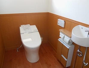 「小便器不要」とおっしゃるお客様は、結構多く感じます。また、和便器→洋便器の需要は、本当に数多くあります。年齢が上がってくると膝や腰など、腰掛ける様式でないととおっしゃるお客様が大半です。こちらの場合は、間口が4尺有って、2室を1室にしましたので、随分、前からすると広々ゆったりしたトイレになりました。腰パネルを回す事で、デザイン的にも、掃除のし易さと言う点でも、とても便器です。 |